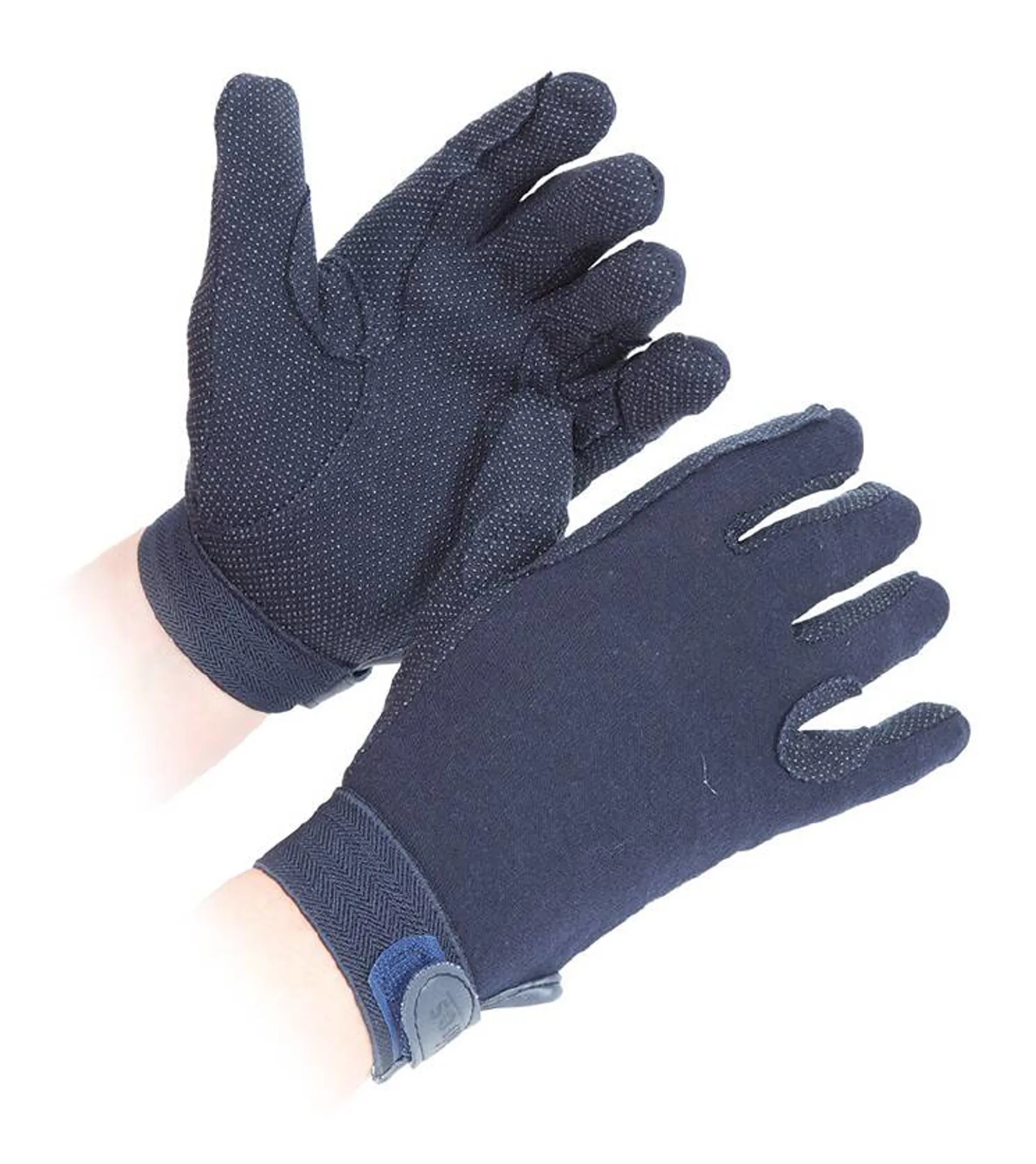 These adults cotton gloves are fitted with elasticated wrists with re-inforced riding and rubber grips.
