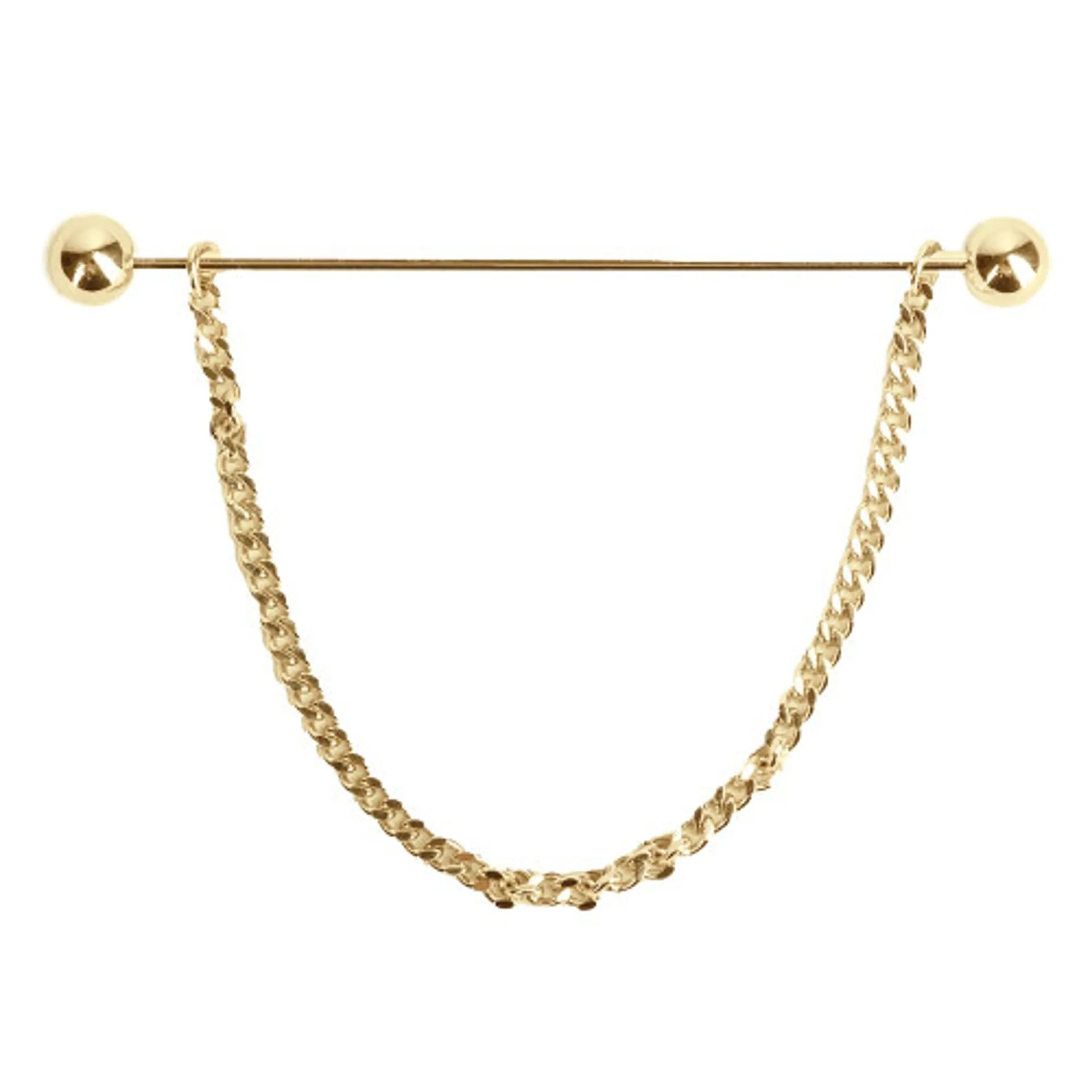 A timeless and classic collar pin with chain, available in gold or silver.