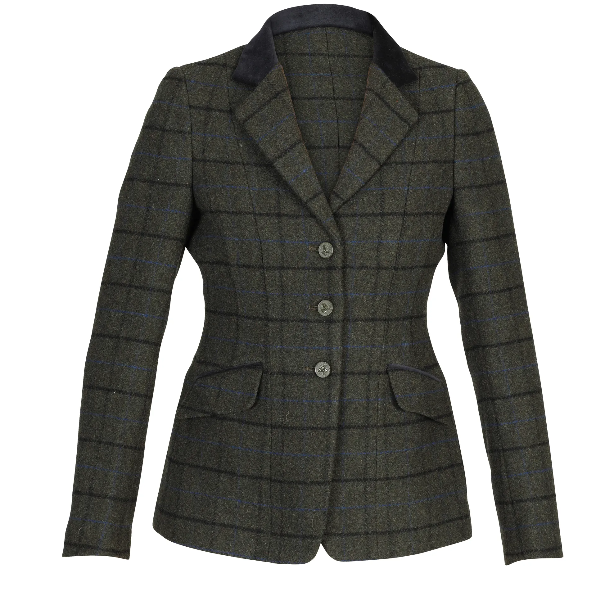 Attractive wool rich tweed cloth is complemented by velvet trims at the collar and pocket and a full satin lining. Suitable for a range of disciplines from showing; competition and countryside pursuits. Style detail: classic fit; velvet trims; 3 button front fastening; button detail at the cuff and back vents; two flap pockets; full satin lining.
