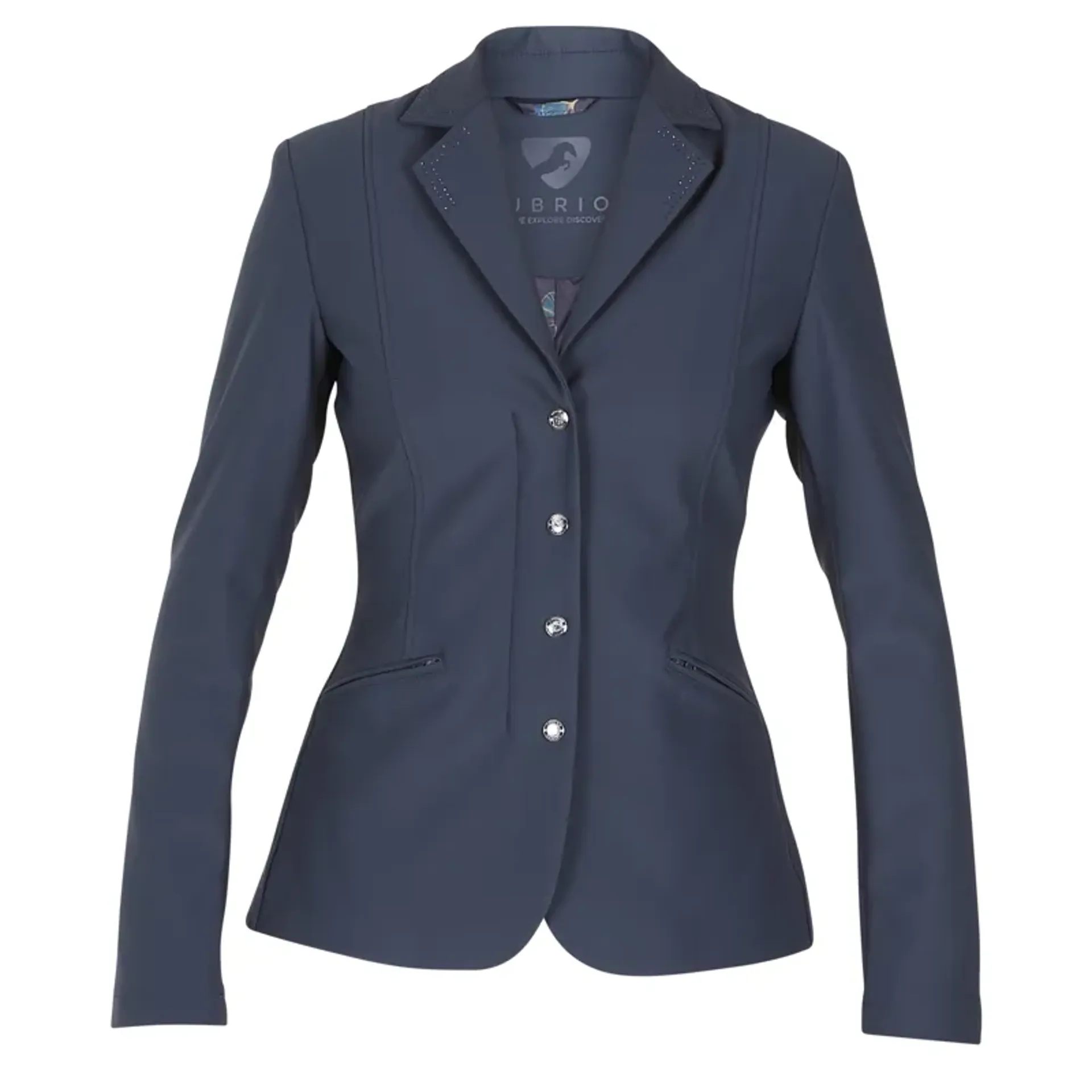 Two rows of self-coloured rhinestones stud the collar; complimentary sparkle enamel buttons feature at the centre front and cuffs. Multiway flex-fit fabric and unlined sleeves give the competitive rider total freedom and a sleek look. Perforated under arm panels look stylish and offer targeted ventilation; fabric is quick drying and breathable.