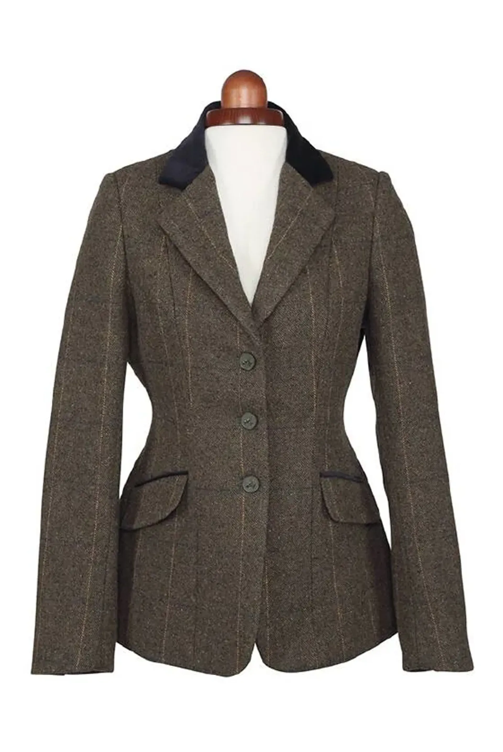 Tailored to flatter, velvet trim collar and pockets, double rear vents, horse button details, two flap pockets, pheasant print lining.