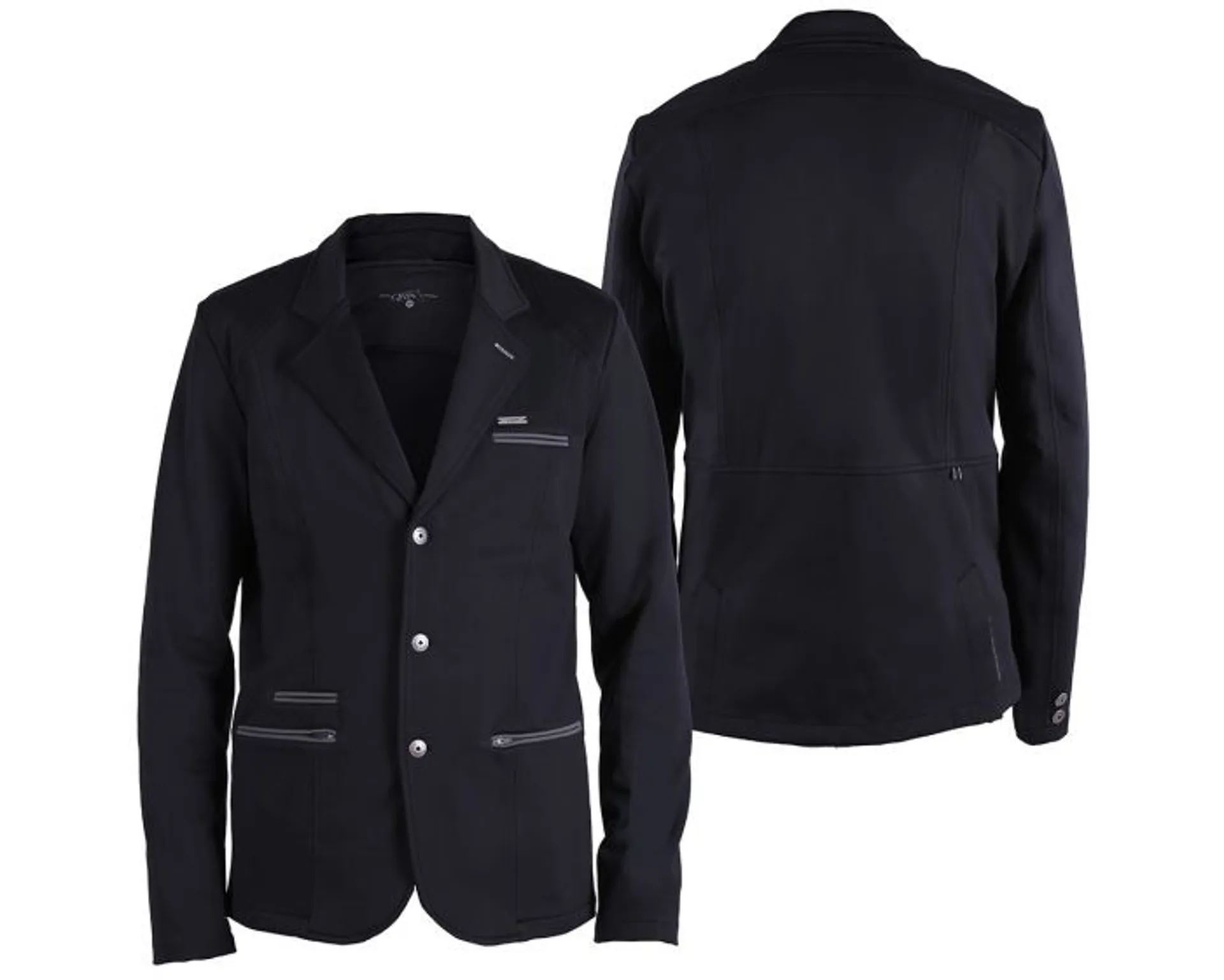 The jacket has two horizontal zip pockets and two faux welt pockets. The metal QHP badge above the breast pocket completes the jacket. "Quality Horse Products" is printed on the right split.