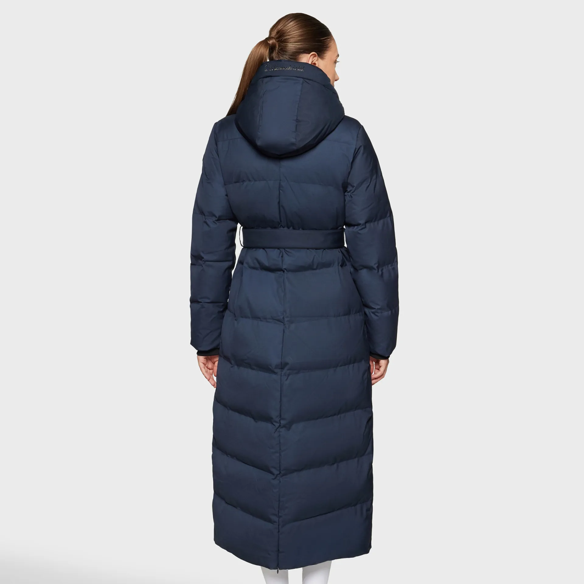 Michaela women's long hooded and belted coat. Ideal for riders and coaches looking for a long crystal style, for difficult conditions.