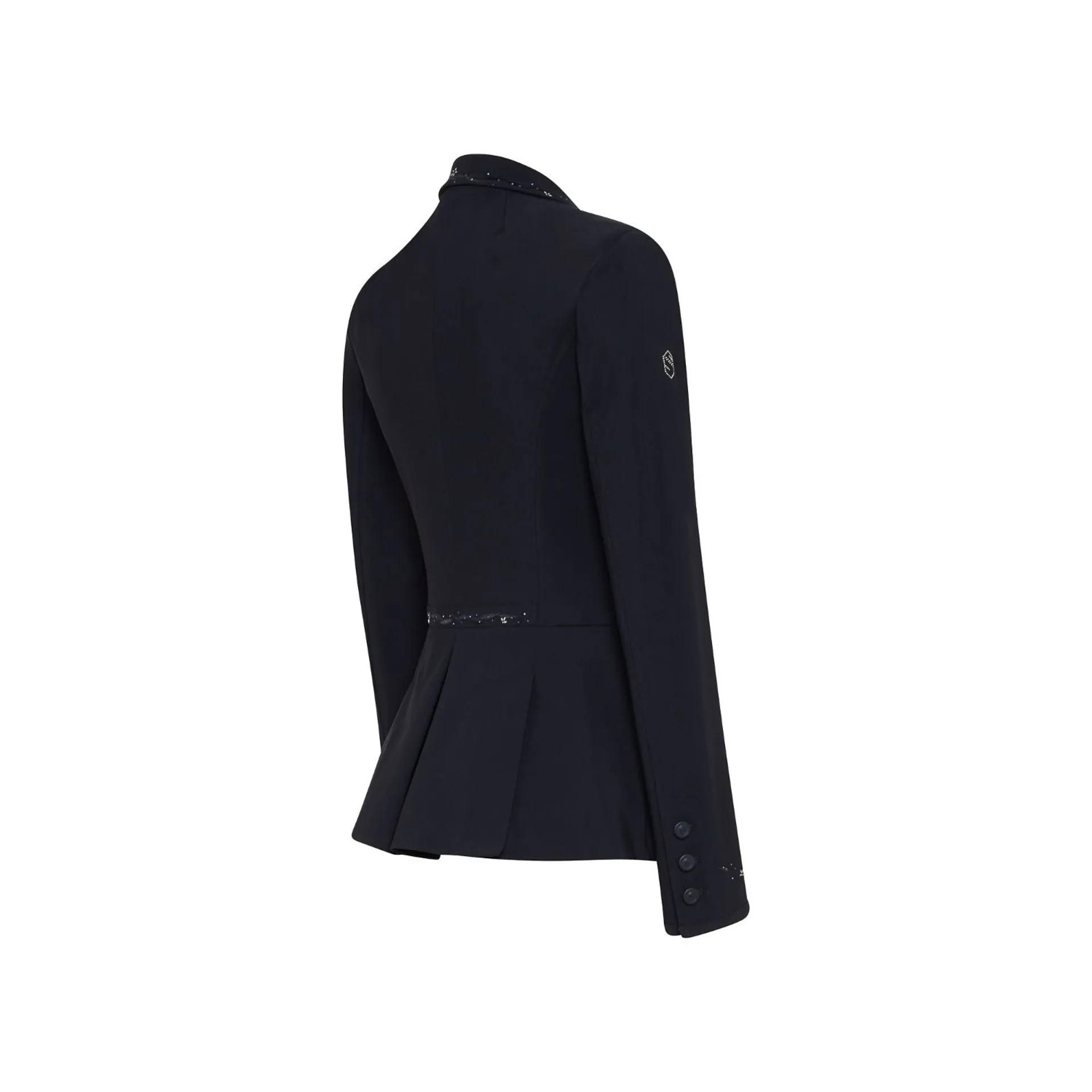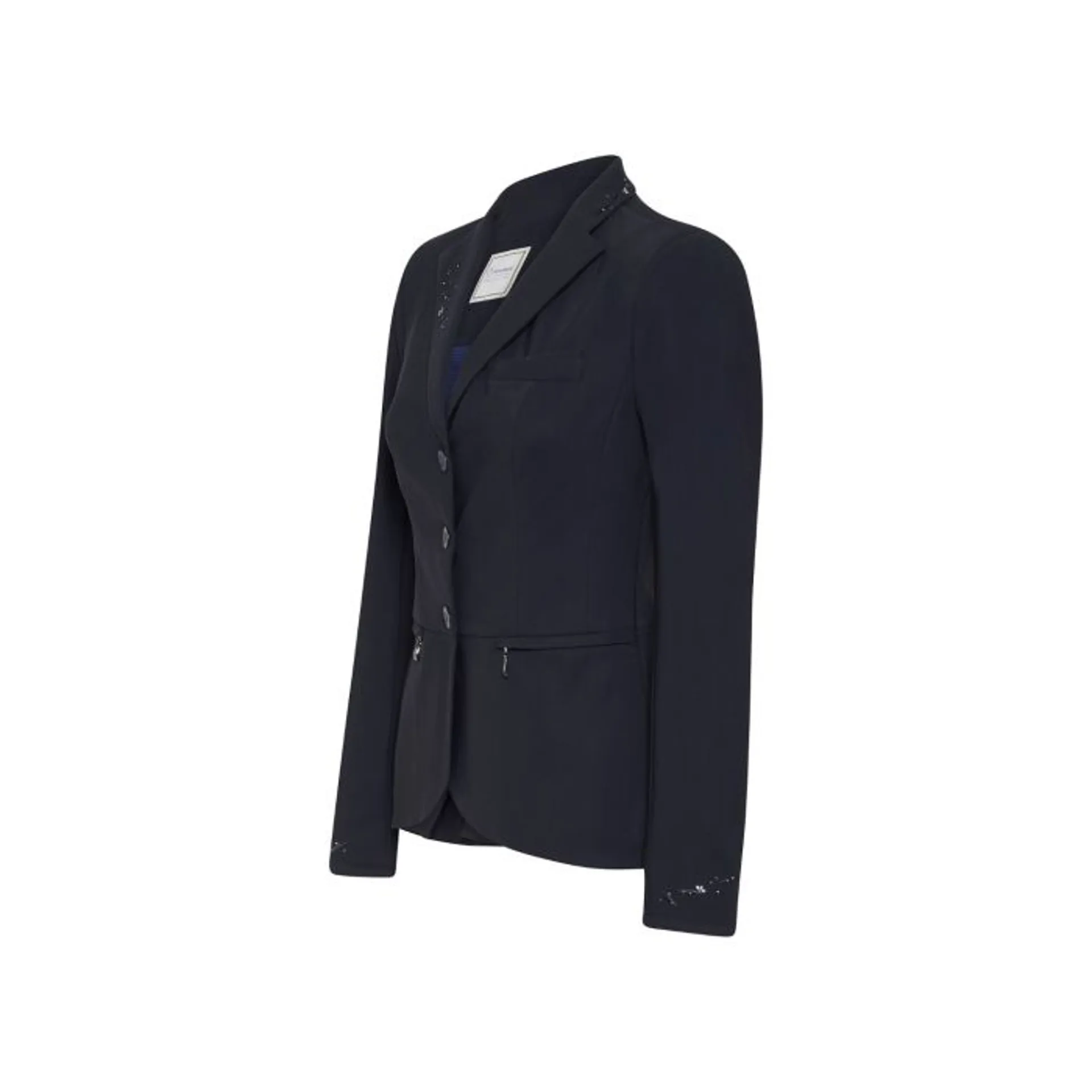The Victorine Flower Jewellery is the height of elegance and sophistication, adorned with a delicate Swarovski flower detailing on the collar, reverse and cuffs. The fabric is breathable, high stretch with an incredibly flattering design thanks to the long fan finish on the reverse and shorter cut at the front, allowing the rider to feel and perform at their best.
