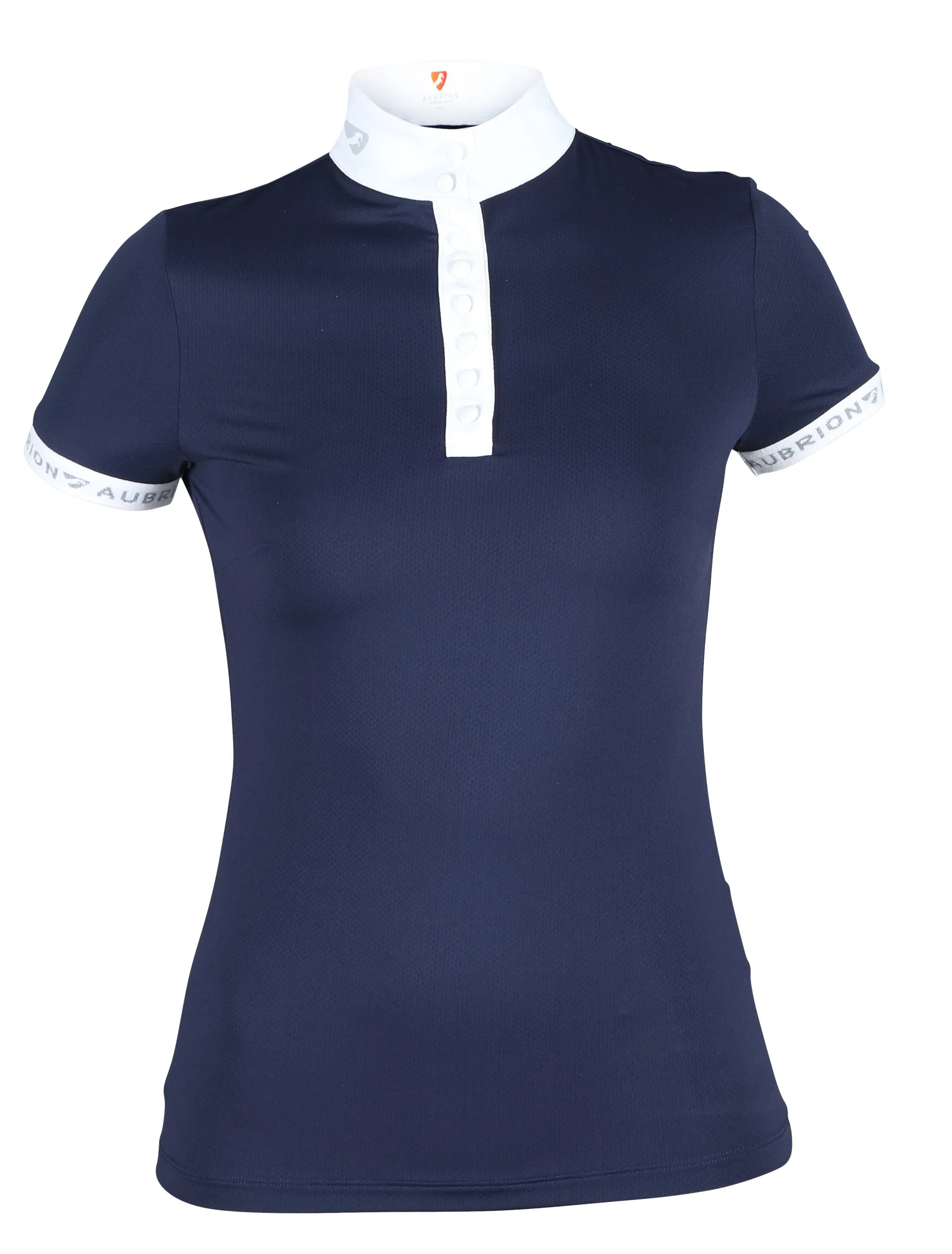 The highly wicking and quick drying performance fabric keeps the rider cool and dry. Style detail: stretch fabric; cotton collar; ribbed cuff detail; fabric covered buttons; aubrion emblem.