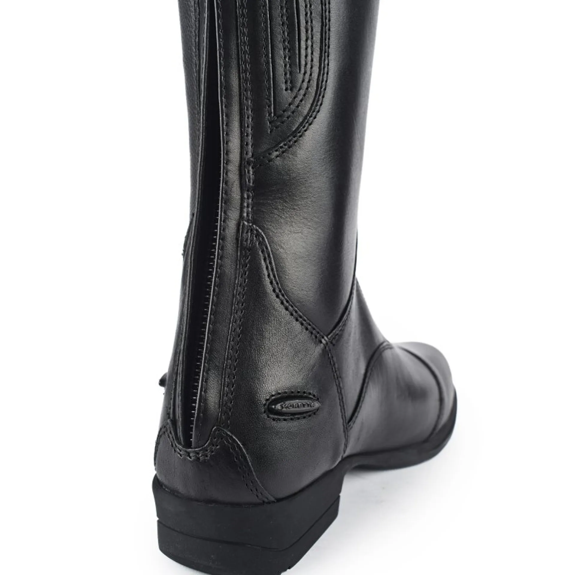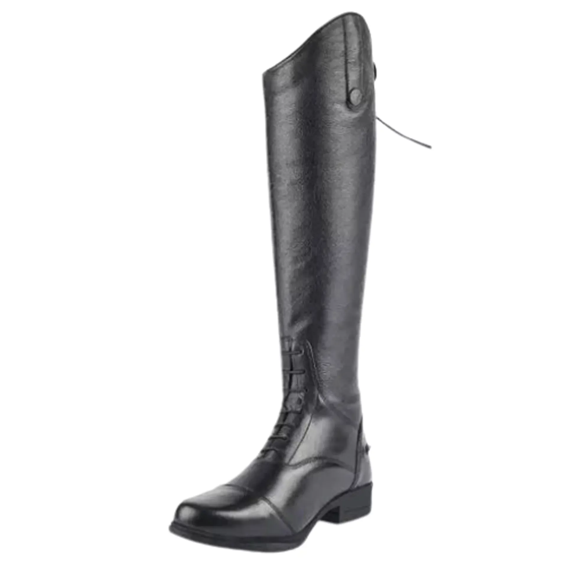 The Gianna field riding boots add a polished, professional touch to your riding. A close leg fit is achieved by pairing hard wearing leather inner calves with softer stretch outer panels that hug the leg. Stretch mock lace detail. Dressage cut tops with soft piqued leather inners. YKK zips. Wicking linings for acclimatised feet. ActiveFit insole with Impact Support System. Moretta shock absorbing rubber soles with steel shanks.