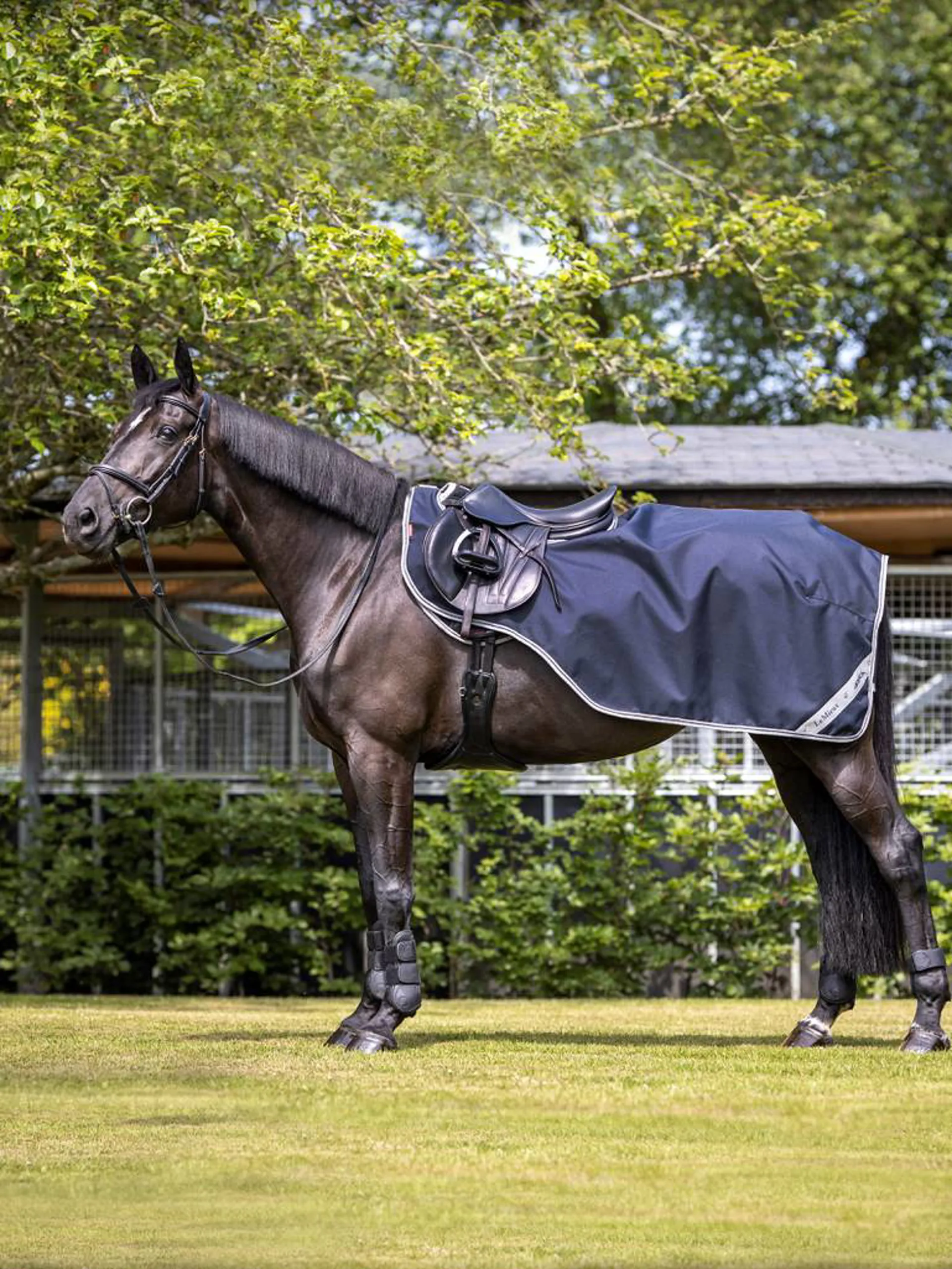 The Lemieux Arika Exercise Sheet has been developed to protect the horse's coat from the elements and prevent chills during warm up or hacking. Cut to wrap around the saddle and under the saddle flap, providing clearance for uninterrupted movement of the riders leg.