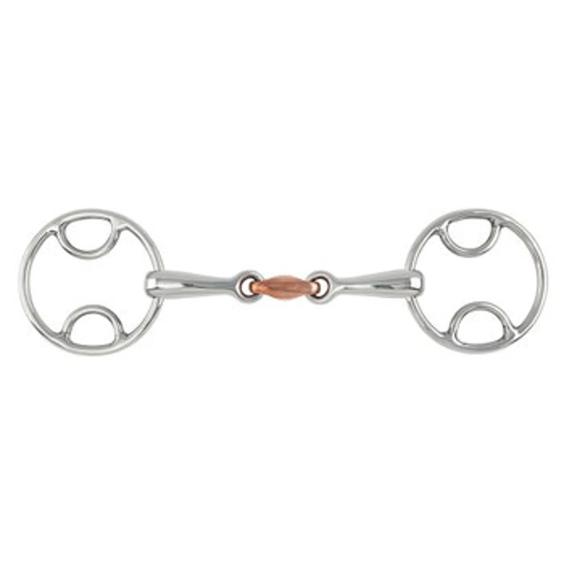 This bevel bit allows mild leverage. A copper lozenge assists with salivation. Mouthpiece thickness: 16mm. Cheek height: 55mm (4.5, 5), 70mm (5.25, 5.5, 6). Stainless steel is the most common material for bits. Durable, easy to clean, tasteless and does not rust. Copper is used in the mouthpiece, creating warmth and encouraging salivation to keep the mouth soft.
