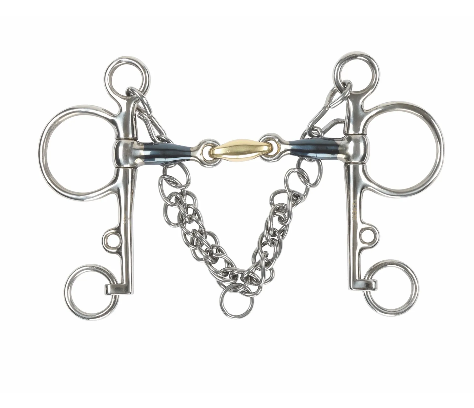 The Pelham is often used to help with control. The lozenge distributes pressure over both the tongue and bars of the mouth. Can be used with double reins or Pelham roundings. Mouthpiece thickness: 14mm. Cheek height: 125mm (4.5), 130mm (5), 140mm (5.5, 6). Blue sweet iron mouthpieces oxidise easily to create warmth with a sweet taste which helps with bit acceptance and encourages salivation. Please note the blue colour will fade with use. Stainless steel is used for the cheeks due to it being durable, easy to clean and resistance to rust.
