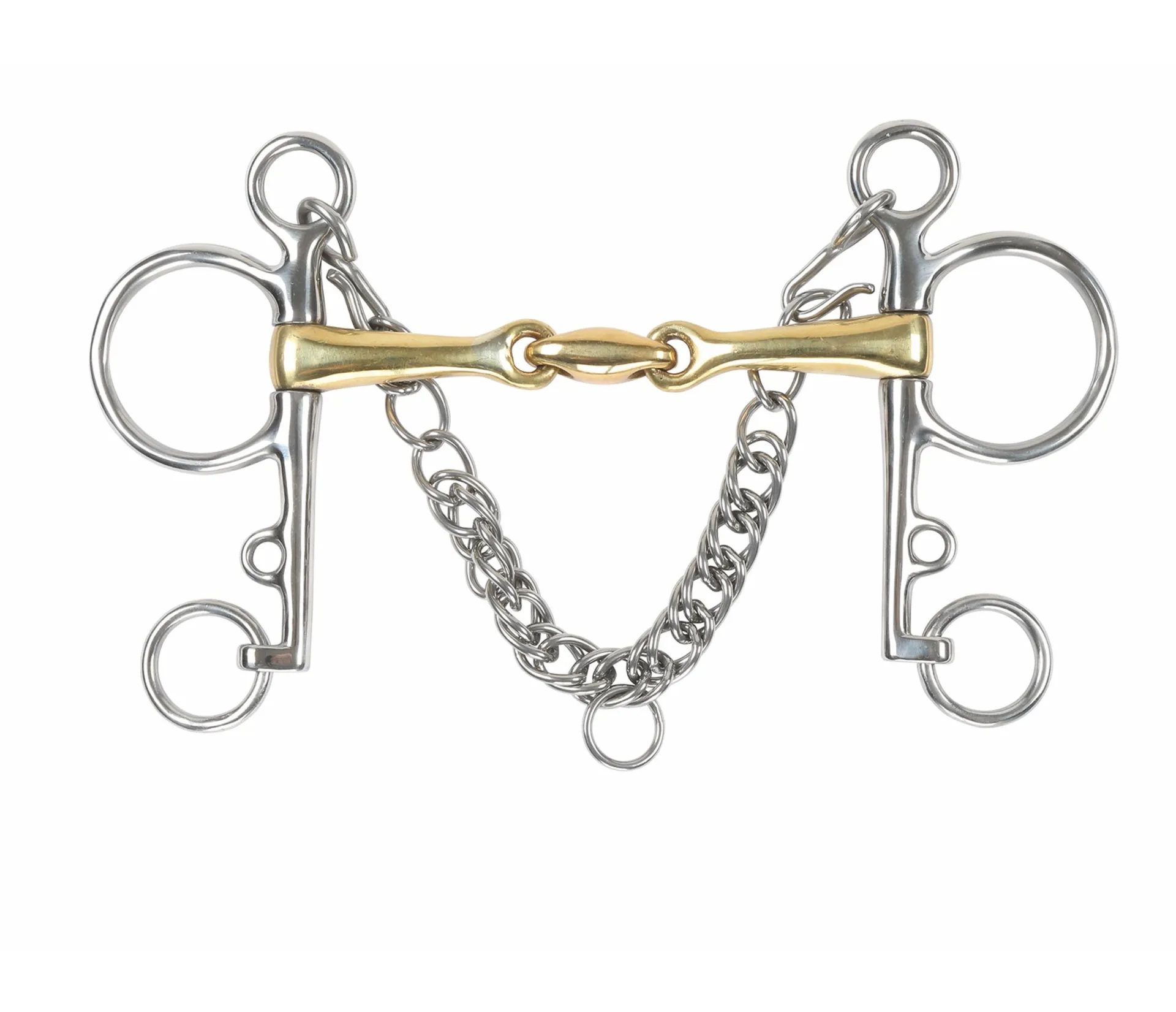 This bit is often used to help with control. The double joint with lozenge softens the nutcracker action and the brass alloy assists with salivation. Can be used with double reins or Pelham roundings. Mouthpiece thickness: 14mm. Cheek height: 115mm (4.5), 130mm (5), 140mm (5.5, 6). Brass alloy mouth: Copper is alloyed with a harder metal to produce warm, durable mouthpieces which aid salivation. Stainless steel is used for the cheeks due to it being durable, easy to clean and resistance to rust.