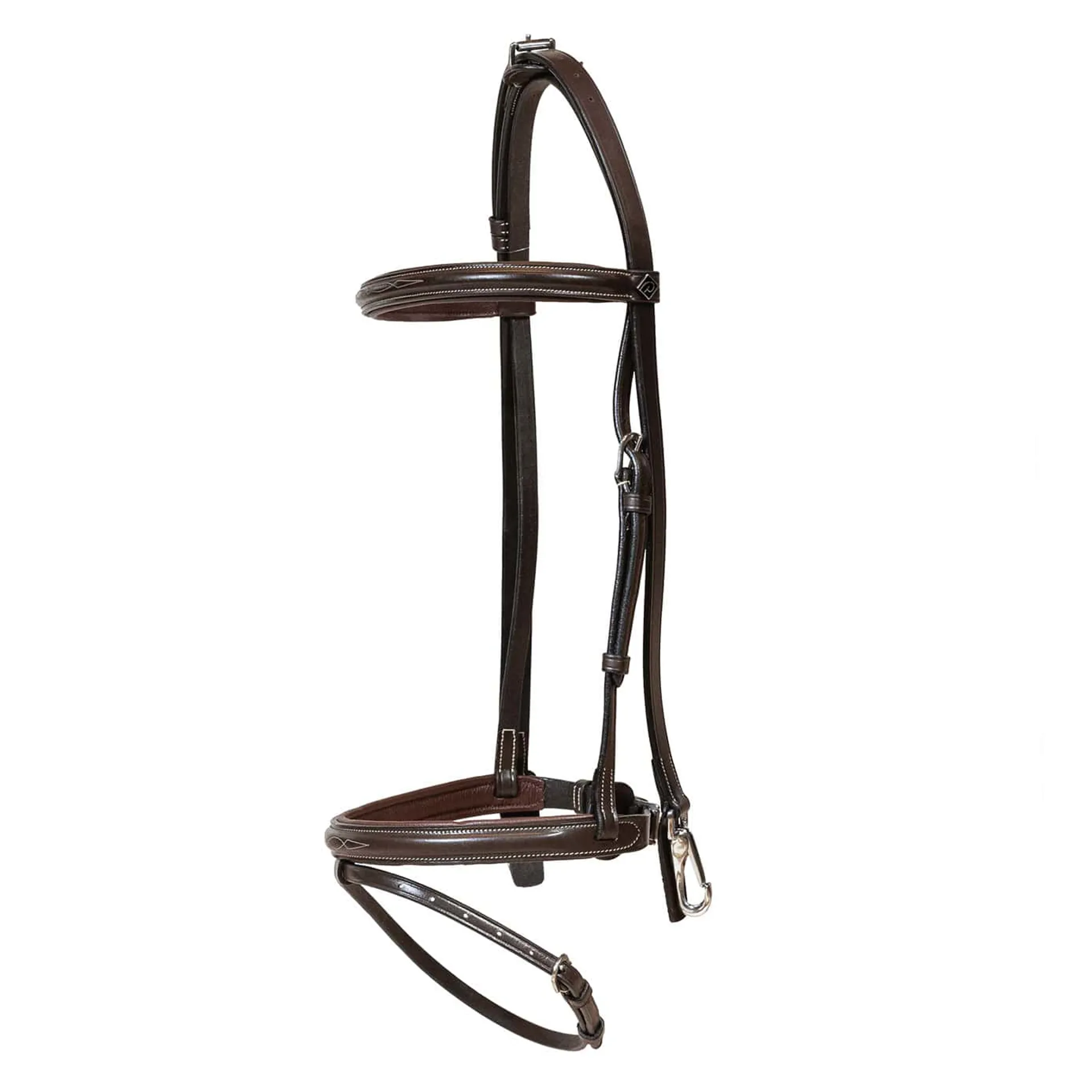 This Bridle has cream stitching and stainless-steel buckles. Fancy stitching details on noseband and browband. Available in brown and black.